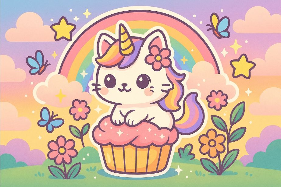I gatti unicorno sono esattamente quello che sembrano: adorabili gatti che sfoggiano un corno di unicorno (e spesso anche una coda arcobaleno, stelle e nuvole). Cerca “kittycorn” o “caticorn” e vedrai i temi che i bambini riconoscono immediatamente: faccine kawaii, cuori, zuccherini, che li rendono perfetti per l’immaginazione della scuola materna/primaria.