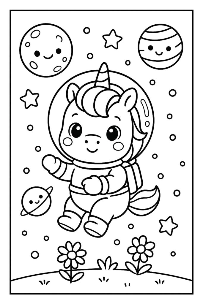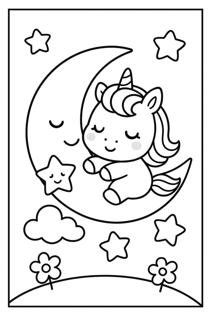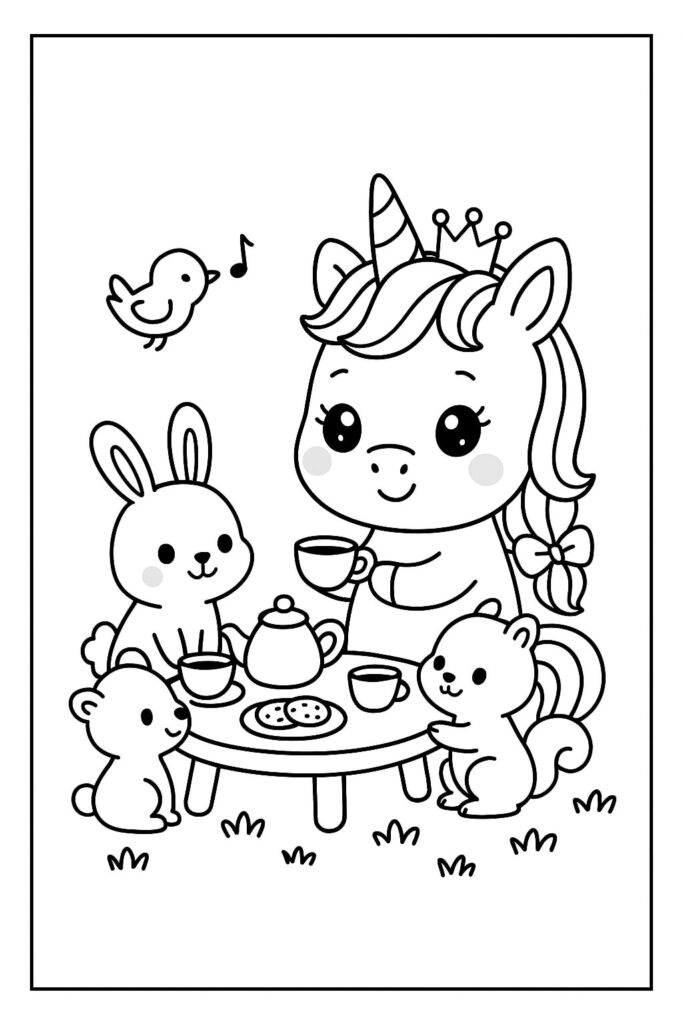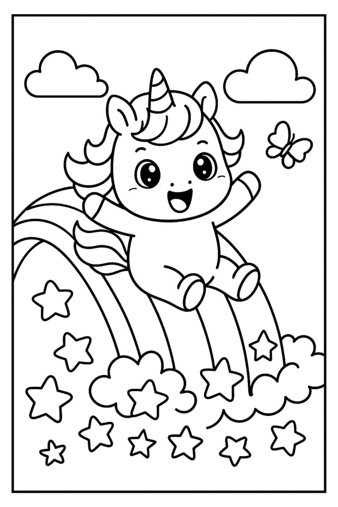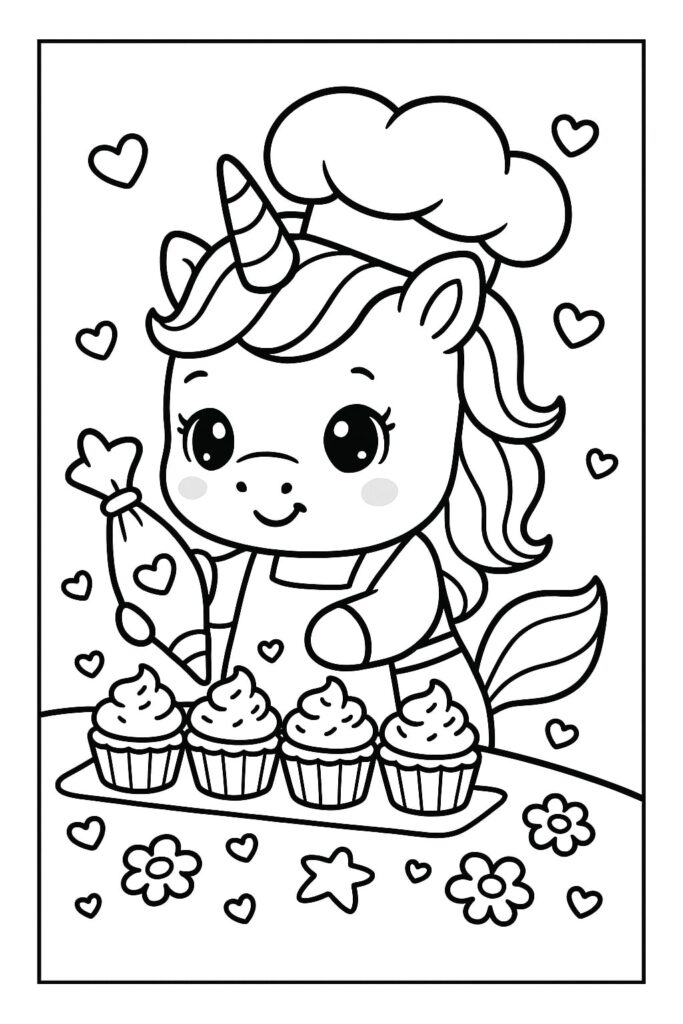 Scegli contorni decisi e un unico personaggio grande con uno sfondo minimo (ad esempio, testa di unicorno kawaii, corno di cupcake). Incoraggia ampi movimenti di colorazione con pastelli o pennarelli lavabili.