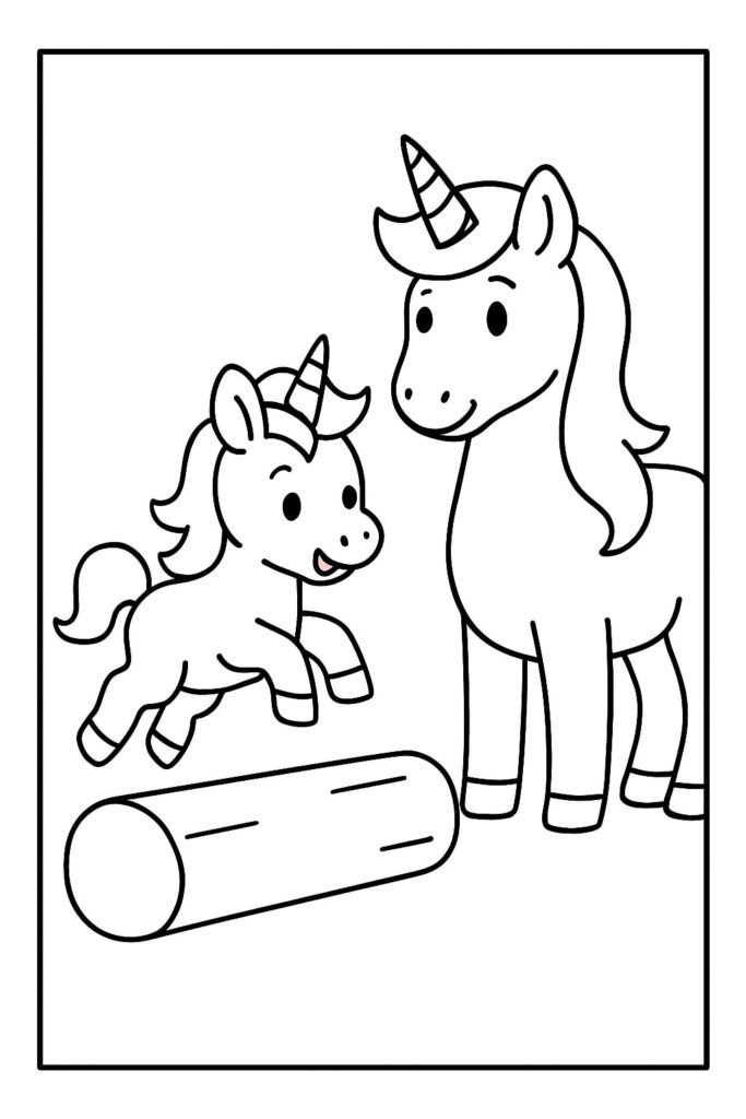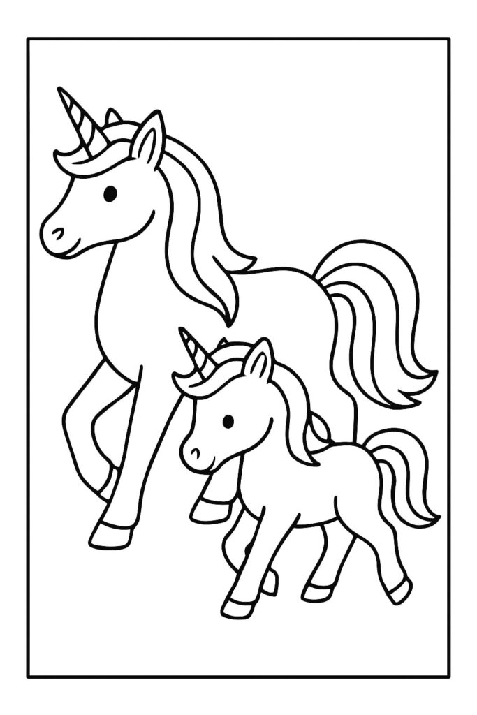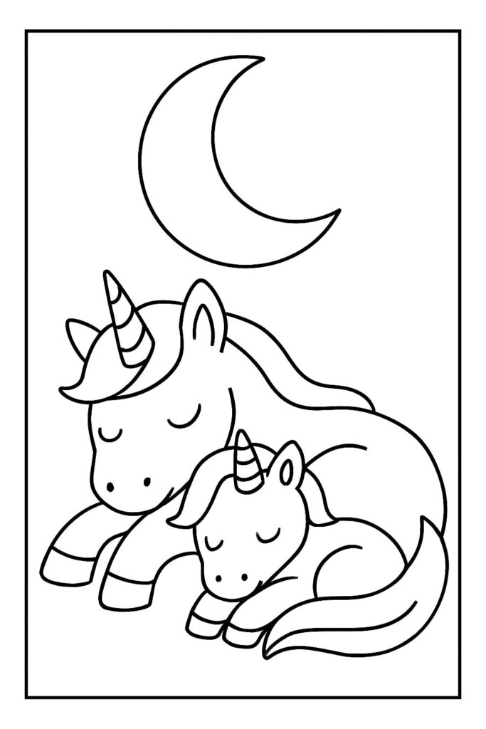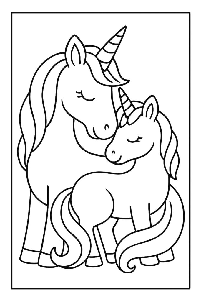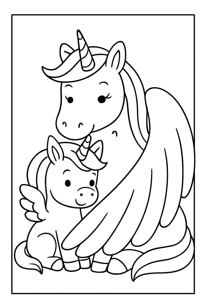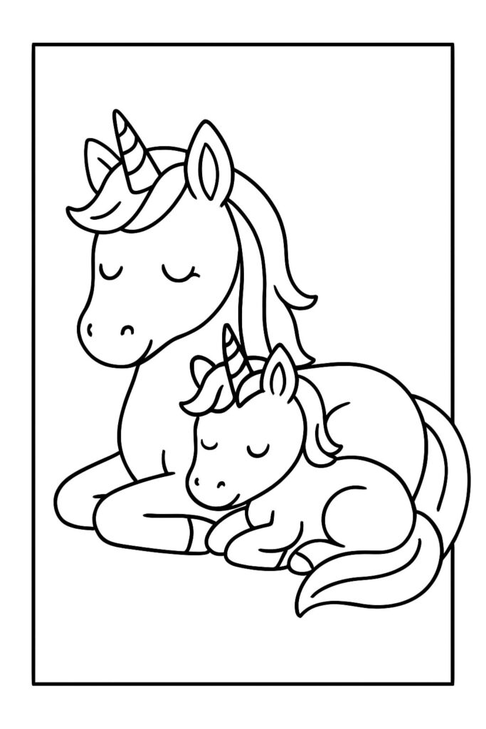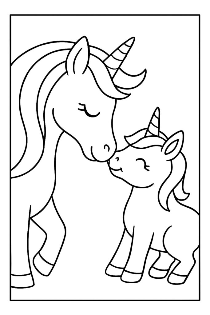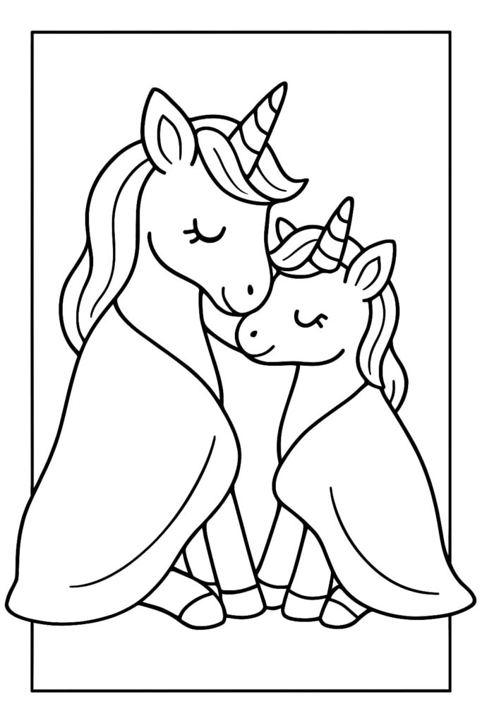 Una mamma unicorno che coccola il suo puledro suggerisce immediatamente la cura, il conforto e il momento della nanna. Questo spunto emotivo aiuta anche i coloratori più riluttanti a impegnarsi: “Cosa sta provando il bambino? Dove sta andando?” Con questa pagina “Mamma e bambino unicorno” è facile iniziare una storia direttamente dalla didascalia dell’immagine.